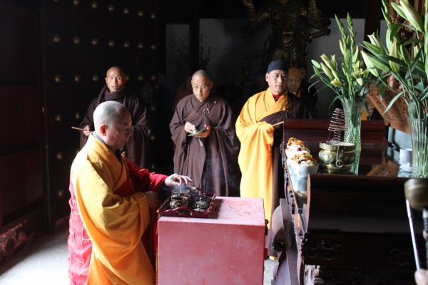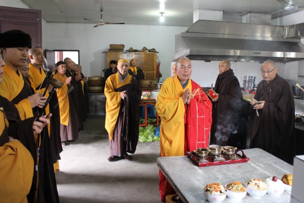 雁荡山能仁寺僧众们前往天王殿韦陀菩萨前上供