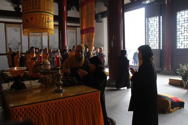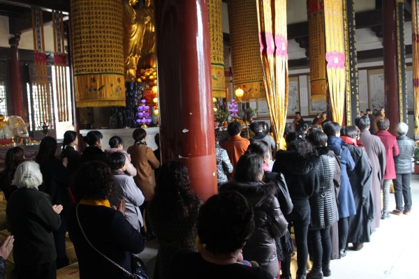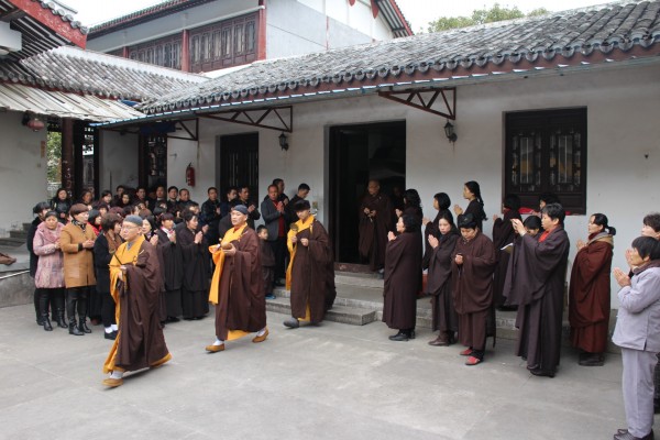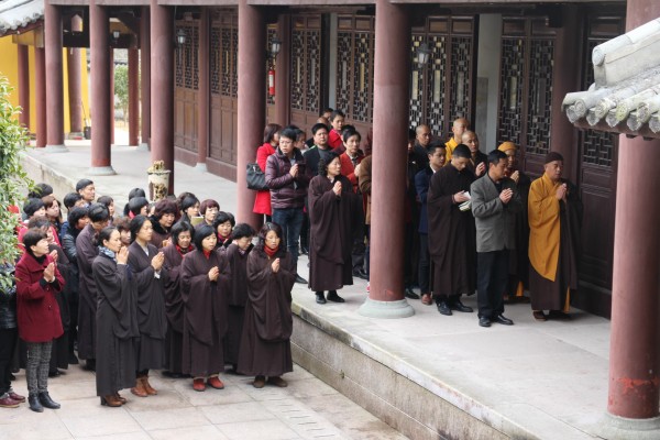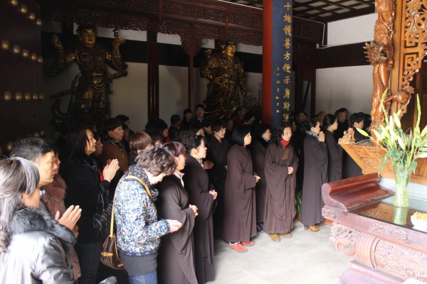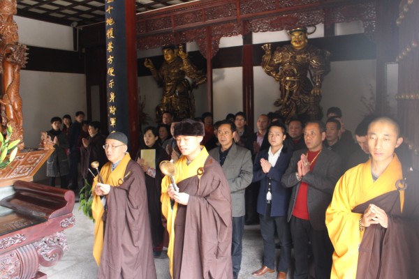 护法善信随僧众们前往天王殿韦陀菩萨前上供