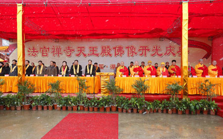 2014年2月9日上午9时,江西九江湖口县法官禅寺隆重举行天王殿佛像开光法会。瑞雪纷飞春增色,佛像开光利人天。古寺重光,佛日增辉,宝像巍巍,龙天欢喜。值此良辰吉日,四方佛子,十方善信数百人同沾法喜,共浴佛恩。