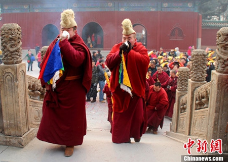 2014年2月14日,农历正月十五元宵节,中国北方最大的藏传佛教圣地河北省承德普宁寺全体僧众举行新春祈愿法会。伴随着浑厚的法号声,普宁寺僧侣们开始举行“转寺”仪式,众僧围绕普宁寺顺时针转一圈。僧众们通过敲钟、转寺、诵经、点酥油灯等方式祈福。(图:张帆)