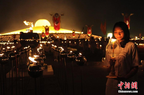 万佛节是泰国四大佛教节日之一,每年都有来自美洲、欧洲、亚洲各国的信众,参加法身寺一年一度的万佛节平安灯法会。参加万佛节平安灯法会的信众一起修持盛钵、静坐、斋僧等各种功德。当晚,参加法会的信众齐聚在大法身舍利塔,点亮近10万盏灯一起供佛。(图/余显伦)