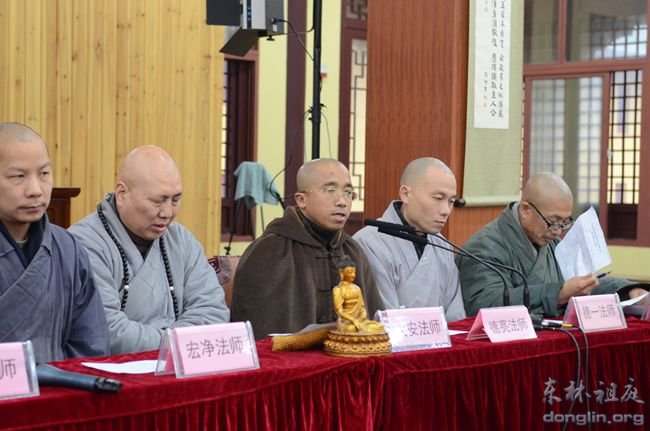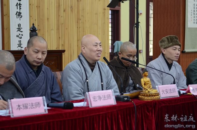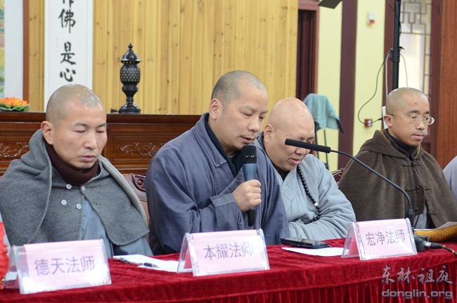 之后,主持人又邀请东林寺知众宏净法师讲话。宏净法师用亲身经历给大家开示如何处理好教、学、修及信愿行之间的关系,勉励大家珍惜法缘,重视实修,和合共住。他还代表常住表示,尽一切所能为大家提供修学条件,让大家安心办道。