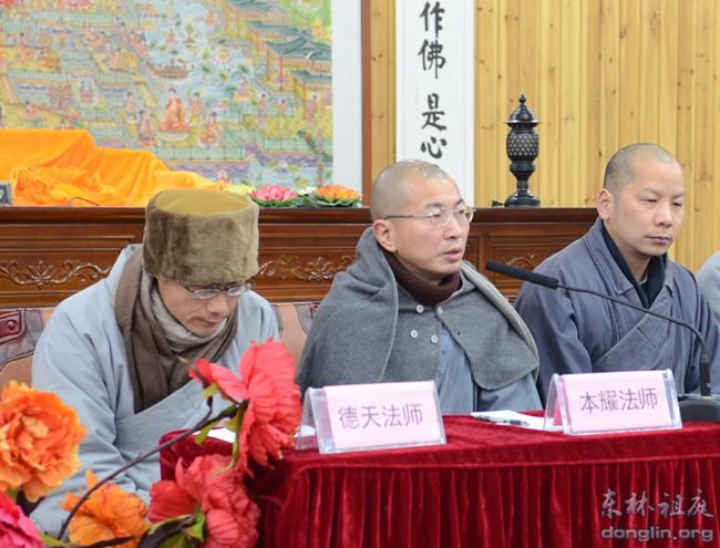 之后,主持人邀请了第四届研习班面授班班主任本耀法师讲话。他极力赞叹东林寺是道风淳厚的难得的丛林,非常景仰上大下安大和尚的德行。他用在佛学院任教务长的经验,以及亲近过多位高僧大德的修为,还有出家二十多年真修实干的修学经历,开导大家珍惜法缘,如法依止善知识,即一定要听话,要时刻检验自己的发心,要时刻端正自己的认识,要具备正知正见。他谆谆教导大家,修学一定要遵守丛林制度,把自己完全交给常住管理,改造习气,完善僧格。勉励大家不辱使命,圆满学业。