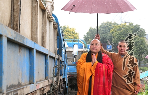光泉大和尚在雪中绕行在每一车众生周围诵经加持