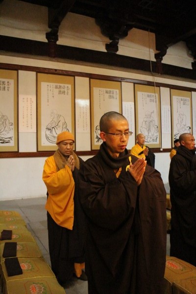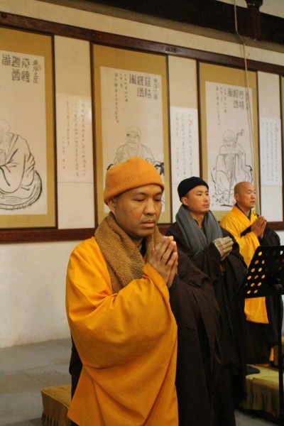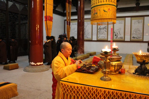 2014年2月14日,农历正月十五日元宵佳节,送别癸巳年,迎来甲午年。千年古道场雁荡山能仁寺,按照百丈清规,如法如律,在大雄宝殿举行2014年度执事请职仪式。凌晨4时30分,雁荡山能仁寺方丈了法大和尚为四大班首、八大执事依次送位。新一届的班首执事,将在雁荡山能仁寺方丈了法大和尚的领导下,禀承佛陀遗教,开拓佛教未来,坚持以持戒为本,禅净双修,以极乐世界为归的学修模式,引导僧俗弟子,愿不辞劳苦、不负众望,为佛教事业尽心尽职,以报佛恩。了法大和尚鼓励新一届的班首与执事,恪守职责,学修并重,兴隆道场,普利众生,为常住发心,为大众习劳, 各司其职。发菩提心、不辞劳苦、任劳任怨,维护道场,以树立寺院良好的学修风气。雁荡山能仁寺常住近三十位法师参加了请执仪式,法喜充满。