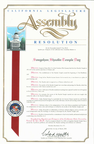 2004年元月,美国加州众议院议会一致通过675号文件决议案,将每年的3月21日正式命名为“嵩山少林寺日”。2009年3月23日,美国加州参议院议会一致表决通过确立每年的3月21日为“嵩山少林寺日”的议案。至此,“嵩山少林寺日”在美国加州参、众议院均获得通过。