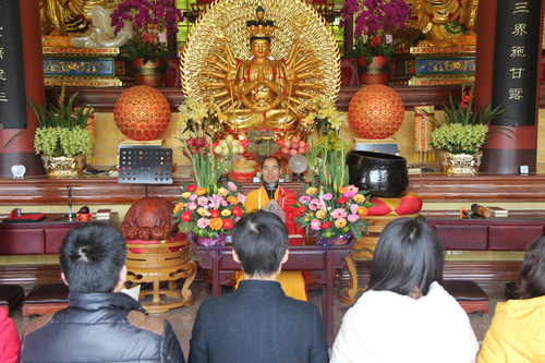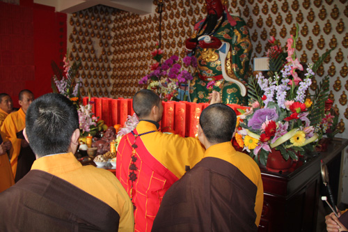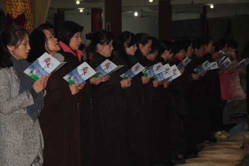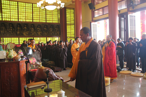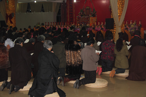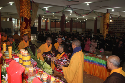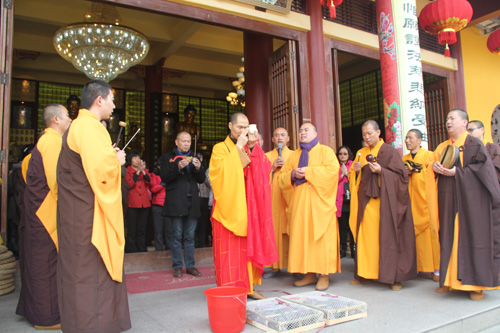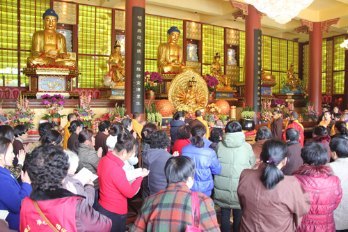 11日凌晨5时30分,于弘法讲堂内举行了清净庄严的岁首斋天法会,斋场四众云集,香支缭绕,忠明法师主法,领众拈香、洒净、齐诵《斋天科仪》及宣读祈福疏文,恭迎诸天降临,护国安邦,消灾除难。中午11时万佛宝忏结束后,大众于大雄宝殿内上药师圆满供、放生及皈依,将此十二天礼拜万佛洪名宝忏的清净功德回向与十方法界,令国土风调雨顺、与会善信合家安康、马年吉祥!