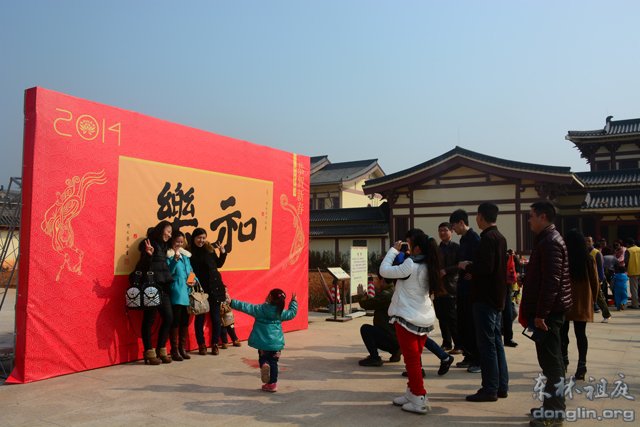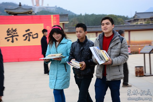进了山门就来到临时接待大厅入口处。首先映入眼帘的就是巨幅“和乐”迎宾牌。这两个字可不简单:它是净土苑对每个人最美好的祝福,而且是由方丈大安大和尚亲笔题写的!很多人在这里排队合影。