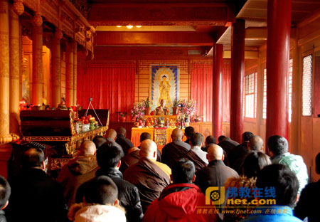 2014年2月12日上午,当大家还沉浸在年味十足的节日气氛中的时候,山西五台山黛螺顶的僧人们却早已经进入了一年当中最紧张的学习阶段。五台山佛教协会会长、黛螺顶住持昌善法师特别邀请中国佛学院讲师宏海法师到黛螺顶为寺院僧众讲解《佛说阿弥陀经》。