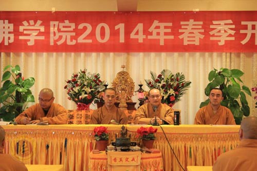 教务长圣悦法师代表学院教务处对2014新学年的全体学僧提出新的要求:要求大家在新的一年要以新的精神面貌来学习,来提高自己的学习和修为,并要求大家要进一步培养道心,坚固道心,要能够经受住而各种的磨练和考验,最终来提高认识,端正修学态度,使自己建立起坚固的道心,这样才不负出家人的使命,才能树立远大高尚的愿力和远大的志向,并要求大家在新学期修学中要放下不合时宜的物质享受,养成一种良好的生活作息习惯,让身心安住在佛法上,以欢喜心和新的精神面貌来迎接新学期的到来,最终圆满完成自己的学习任务。