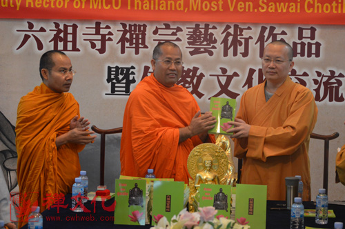 接着萨外副校长说当翻译《六祖坛经》的时候也了解了一些大传佛教,发现南传佛教的禅修和书中所讲内容很相近,然后副校长说三年前玛哈朱拉隆宫大学就与六祖寺有合作项目到现在做泰文版的《六祖坛经》,希望今后有更多的活动合作。六祖寺在大愿法师的领导下,在传播佛法方面做出了很大的贡献,《六祖坛经》中六祖慧能大师的教导,在六祖寺得到践行,比如教育、禅修、佛教书籍的出版,以及社会方面六祖寺都做了很多活动。然后萨外副校长表示只要我们坚持六祖慧能大师传下来的知识,然后再加上我们的努力合作就一定能取得更好的成就。把六祖慧能大师的智慧付诸到实际当中,第一是通过书籍的形式;第二是互联网;第三是融入到生活当中。萨外副校长表示此次来访六祖寺所学到的东西,回到玛哈朱拉隆宫大学会告诉学生,这里在大愿法师的领导下把六祖大师的教导执行的非常好。萨外副校长表示在翻译《六祖坛经》过程中感觉到慧能大师的教导对学佛人有很大的帮助和指导,现在这本书对玛哈朱拉隆宫大学那里的25000名学生也有很大的指导意义,学生通过学习这本书可以把里面的教导运用到他们的生活中然后再传播给别人。最后萨外副校长表示今后会继续出版这本书。