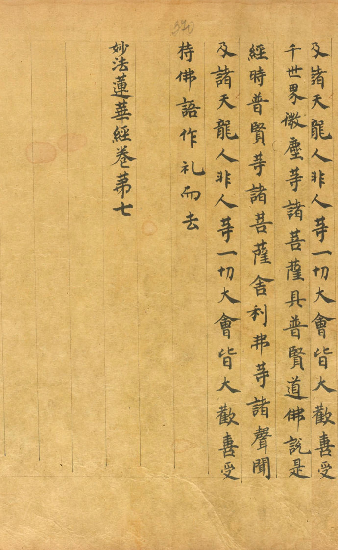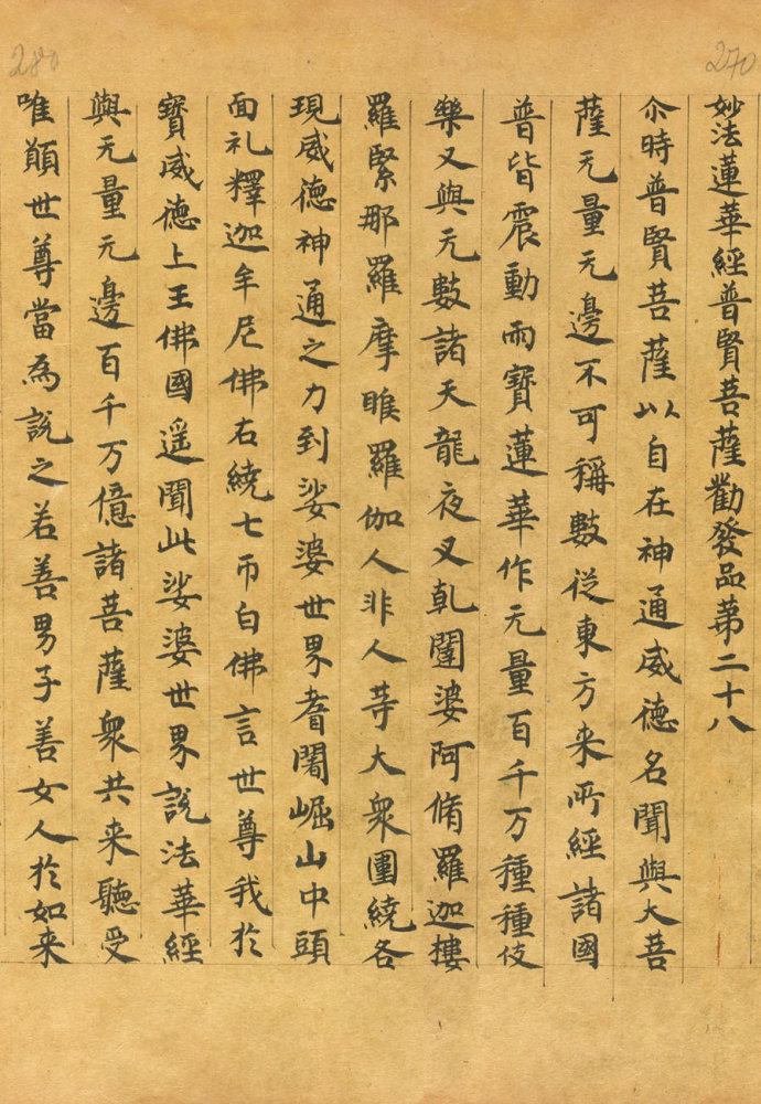 尔时普贤菩萨、以自在神通力,威德名闻,与大菩萨无量无边不可称数、从东方来,所经诸国,普皆震动,雨宝莲华,作无量百千万亿种种伎乐。又与无数诸天、龙、夜叉、乾闼婆、阿修罗、迦楼罗、紧那罗、摩侯罗伽、人非人、等,大众围绕,各现威德神通之力。到娑婆世界、耆阇崛山中,头面礼释迦牟尼佛,右绕七匝,白佛言:“世尊,我于宝威德上王佛国,遥闻此娑婆世界、说法华经,与无量无边百千万亿诸菩萨众、共来听受,惟愿世尊当为说之,若善男子、善女人,于如来灭后,云何能得是法华经?”