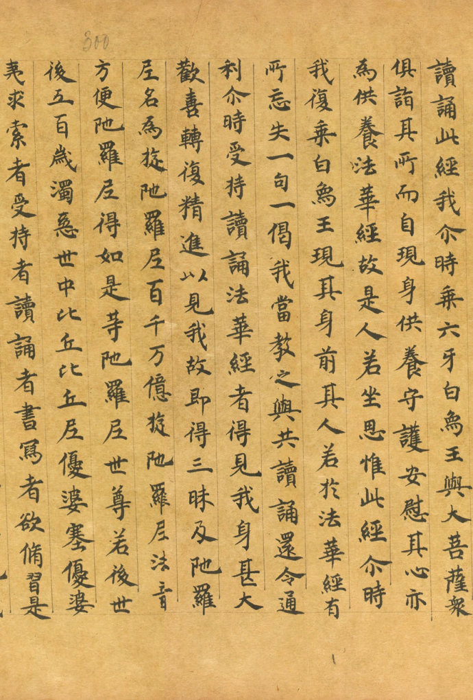 “世尊,若有菩萨得闻是陀罗尼者,当知普贤神通之力,若法华经、行阎浮提,有受持者,应作此念:‘皆是普贤威神之力。’若有受持、读诵,正忆念,解其义趣,如说修行,当知是人、行普贤行,于无量无边诸佛所、深种善根,为诸如来、手摩其头。若但书写,是人命终,当生忉利天上,是时八万四千天女、作众伎乐而来迎之,其人即著七宝冠,于婇女中、娱乐快乐,何况受持、读诵,正忆念,解其义趣,如说修行。若有人受持,读诵,解其义趣,是人命终,为千佛授手,令不恐怖、不堕恶趣,即往兜率天上、弥勒菩萨所,弥勒菩萨、有三十二相大菩萨众所共围绕,有百千万亿天女眷属,而于中生,有如是等功德利益。是故智者,应当一心自书,若使人书,受持、读诵,正忆念,如说修行。”