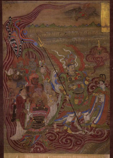 毘沙门天的前面,有举止优雅,向同一方行进却回头看他的妹妹功德天,手捧盛满花的金色盘。其对面的婆薮仙,以手持金杯,缠白腰布,脚穿靴的白髮老人的形象出现(参照图16-4)。其后有身著绿衣,手持火焰宝珠的健壮的像。松本荣一博士认爲该像是毘沙门天五个儿子之一。左方也有一身合掌的像,头戴顶部分成四块的冠。他没有武装,也没有携带物品,认爲与上一图的手持笏陪同夫人的供养人像相同。但在本图中,其像与整体非常协调,正如松本博士所提议的,看作是毘沙门天的一个儿子更爲贴切。离他很近的后方,有一长著美丽的鬍鬚,头戴奇特帽子的像,拉开弓箭的架式,像是要射向画面右上角慌忙飞过的迦楼罗。松本博士指出,绘有毘沙门天的吐鲁番地区的壁画中,有几处相同的迦楼罗的影子,它象徵用毘沙门天的力量可赶走的恶势力。此画的其他诸像,正如松本博士所述,著于若干经典中,是天王侍从五夜叉中的四像。场面设置是毘沙门天所守护的须弥山北方。