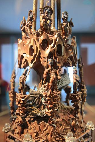 宝幢的制作综合运用木雕、玉雕、漆雕、穿珠、描金、金银细工等各种工艺,所用珍珠达四万多颗,令人叹为观止。
