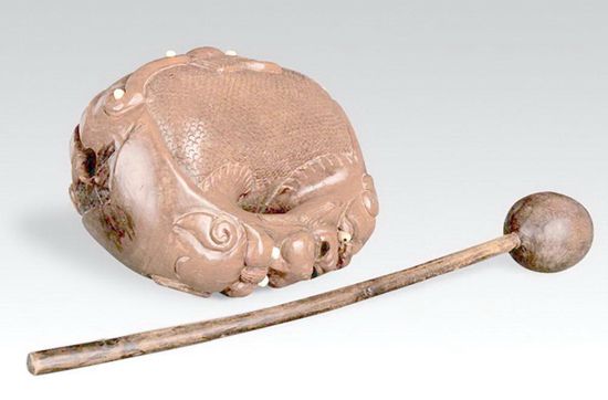 一般,木鱼都是横穿腹部中央,作中空的团栾形,头部、鳞甲、龙珠等多隈以黑漆,押上金箔,其它部分则涂以朱红;安于小布团上,以包皮的木槌敲击腹部中央。至于体积大小,普通是径一尺乃至六尺,较小的则有三寸乃至五寸等。