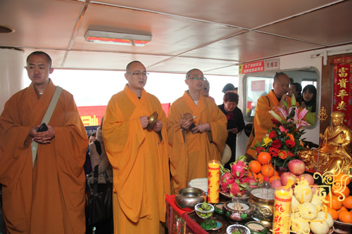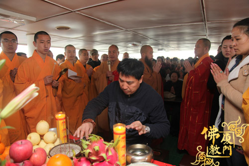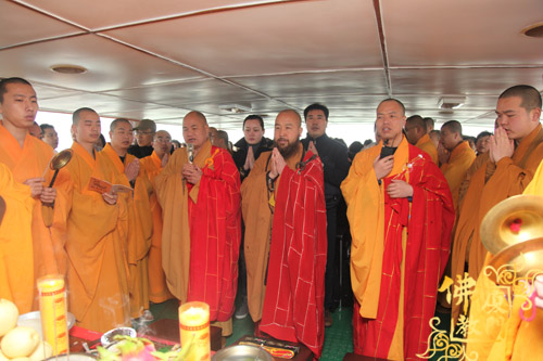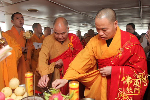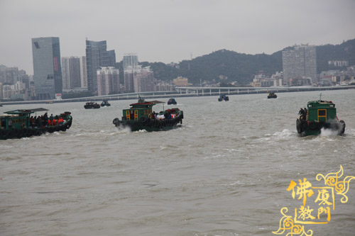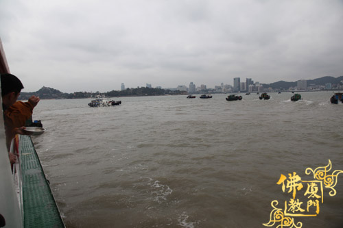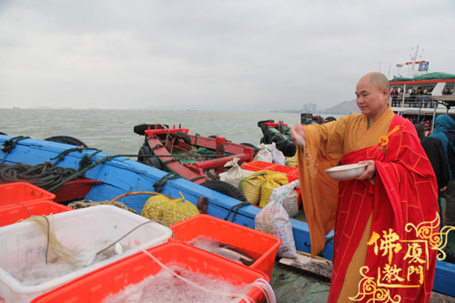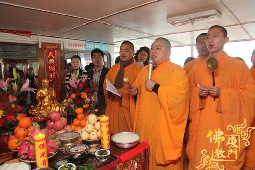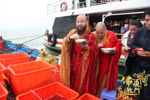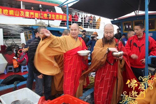 上午8时许,载满各类水族的十二艘放生船驶向安全海域,由甘肃崆峒山法论寺住持妙林大和尚,厦门市佛教协会副会长、能仁寺住持能元法师等三位大德法师为放生法会主法。三位主法法师手执杨枝遍洒净水,率众持诵大悲神咒,净水遍洒水族,令彼灭罪除愆、罪业清净、堪闻妙法、获大解脱。并为彼忏悔、皈依、开示妙法。最后,放归大海,得大自在。