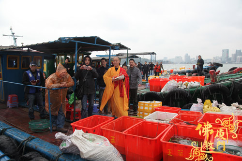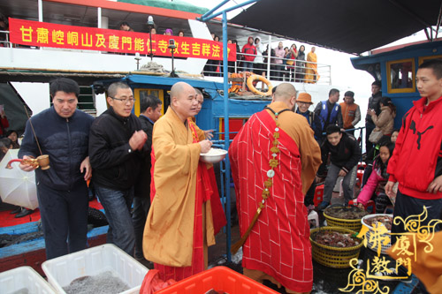 【厦门佛教在线】3月2日报道:今天是农历二月初二,一个吉祥的日子,甘肃崆峒山法轮寺及厦门能仁寺大型放生吉祥法会在厦门第一码头隆重举行。将价值四十三万余元的各类水族放回大海。来自全国各地佛教四众弟子五百余人随喜参加了此次放生活动。