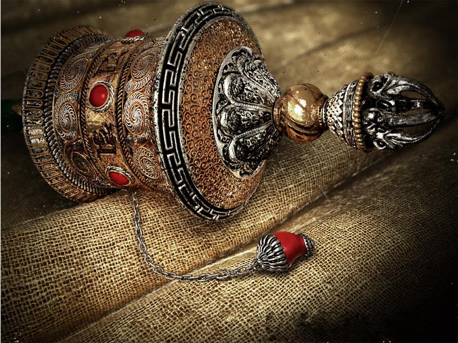 21. 转经轮所佩带的坠石,象征着弘法利生事业非常圆满。经轮顶端的华盖,象征可以圆满十地,教证二法究竟圆满。如果一边持咒,一边转经轮,象征今生获得佛果。