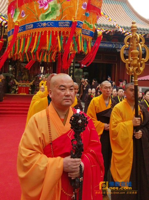 接着,在仪仗队法师和居士们的恭迎和护持下,昌静法师依次在山门、天王殿、祖师殿、大雄宝殿拈香礼佛,行至大雄宝殿时,成刚长老为昌静法师送位。至方丈室时,照元长老为昌静法师送座。整个仪式场面宏大,次序井然,如法如律,龙天欢喜。