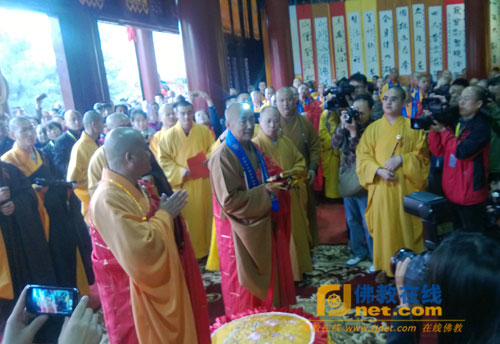 上午8时许,在明月禅寺山门前,昌静法师拈香说法,虔诚礼佛。随后纯一法师为昌静法师送祖衣、法映长老为其挂珠、清远法师送拂尘,性妙法师送钵,理因法师送锡杖,道极法师送具,觉来法师送如意,亲海法师送龙杖。