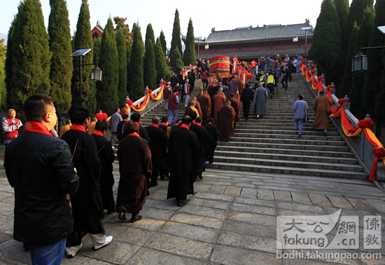 随后,明基法师来到法堂,江苏省无锡市祥符禅寺方丈无相长老为明基法师送座,明基法师登法座,升座法会达到高潮,现场诸山大德及四方佛子齐诵经文,祈愿风调雨顺,国泰民安,世界和平。