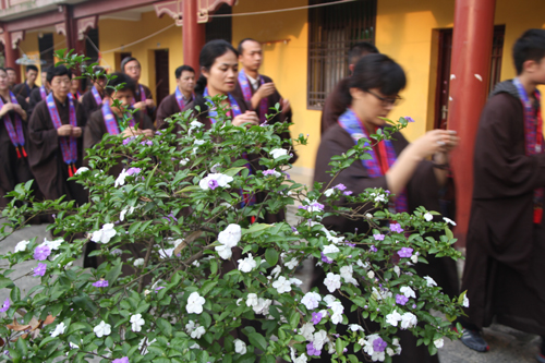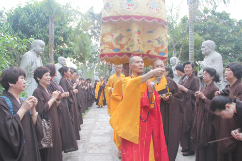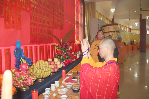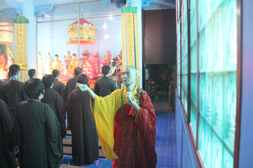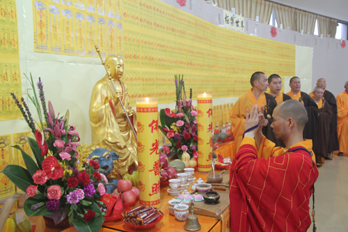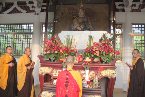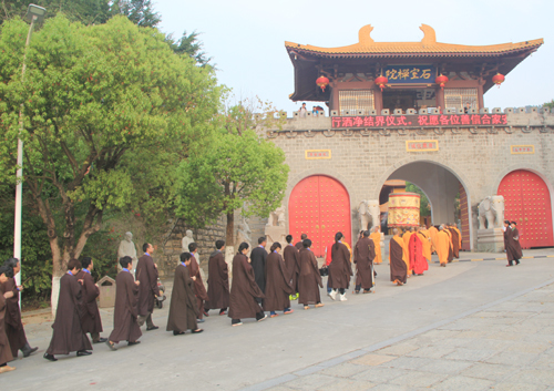 2014年3月29下午16时,海沧灵鹫山下药师佛古道场石室禅院内钟鼓齐鸣,四众善信列队称诵药师佛圣号,恭请石室禅院住持忠明法师至弘法讲堂,隆重主持“七七49天药师佛许愿”大法会洒净结界仪式。