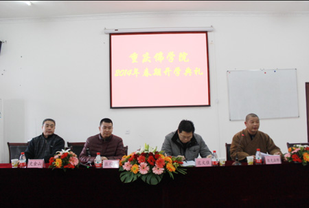 2014年3月1日上午,重庆佛学院2014年春期开学典礼在学院四楼多媒体教室举行,市委统战部民宗处处长范文佳,市民宗委宗教三处调研员史金山,市佛教协会教务办主任张和平,佛学院常务副院长朗光法师及全院师僧出席了典礼。典礼由朗光法师主持。
