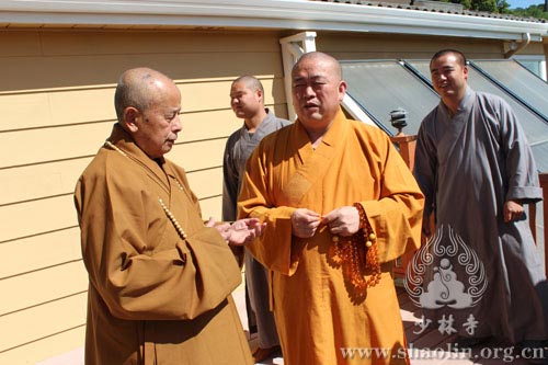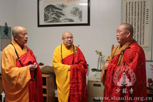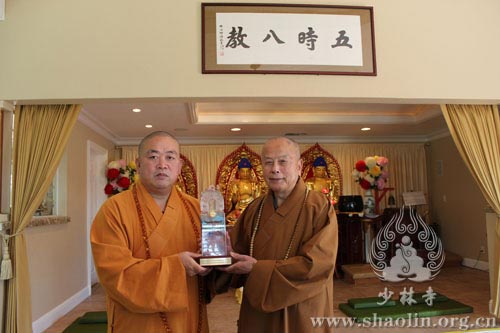 祈福法会结束之后,应美国旧金山佛山寺住持智海法师的盛情邀请,永信法师一行赴美国佛山寺参访,先后参观佛山寺般若讲堂及禅净学院等地。永信法师对智海法师在美国弘法四十余年的悲心愿力赞叹不已,并邀请其有空再去少林寺参观交流。少林寺于2013年4月19日至5月17日举办三坛大戒传戒法会期间,智海法师担任羯磨阿阇黎,为新戒开示羯磨法,深受大众欢喜。(文、图:邹相)