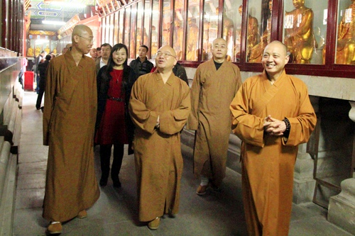 隆印大和尚陪同客人游览武汉归元禅寺并介绍了归元禅寺的历史文化和发展情况。武汉归元禅寺,是一座具有300多年历史的著名古刹,历经300多年的变化、发展,到今天已成为一座享誉中外的著名佛教丛林。