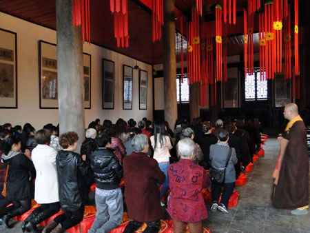 法会开始时,宝光寺僧众率居士代表恭敬迎请寺院方丈意寂法师,在庄严肃穆的气氛中,意寂法师拈香礼佛。之后升入法座,意寂法师为前来求授皈依的善信正式传授三皈依,并慈悲为信众开示“三皈依法”、佛弟子所具备的佛教基本礼仪、皈依三宝意义及如何在生活实践中运用佛法等。