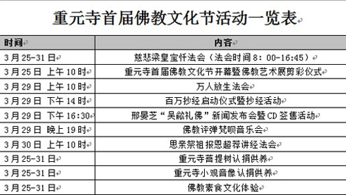 为展现重元寺一千五百余年的悠久佛教文化底蕴,弘扬人间佛教慈悲、和合、环保、护生的理念,向社会传达积极正面的人文力量,重元寺将于2014年3月24日-31日举办首届佛教文化节活动。活动将以慈悲梁皇宝忏大法会贯穿一周,期间举办佛教书画、评弹梵呗、大型放生、百万抄经、树木认养、素食体验等丰富多彩的佛教文化活动,诚邀十方善信和海内游客前来共沾法喜,同参盛会。