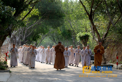 清晨的清云山,山间一片晴朗。大众云集于山门,排起三行长长的队伍。定光寺全体僧众,广东尼众佛学院全体师僧及外护居士共三百多人在院长达理法师和定光寺常住超诚法师的带领下,三步一顶礼,一拜一称颂,虔诚恭敬地朝着定光寺的观世音菩萨的殿堂——紫竹林而朝拜。