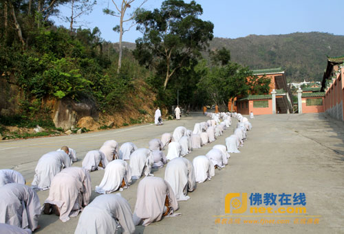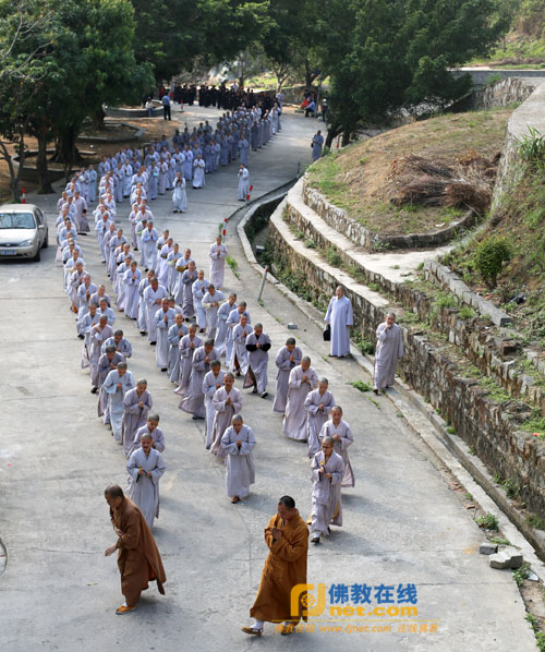 2014年3月19日上午8点,时值农历二月十九观音菩萨圣诞。广东省汕尾市陆丰定光寺、广东尼众佛学院举行三步一拜朝山祈福活动。