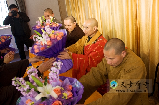 在学佛班教室,全体学员起立恭迎诚信大和尚,并唱诵《炉香赞》、《心经》。随后,在舒缓的音乐声中,学员代表分别向在主席台就坐的天童禅寺方丈诚信大和尚,当家师计艺法师,知客师圆通法师,副寺道国法师,衣钵师觉性法师献花,以表达感恩之情。
