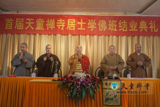 结业典礼由天童禅寺副寺、学佛班班主任道国法师主持。道国法师首先作了简要总结。本届学佛班自2013年3月2日开班以来,在诚信大和尚以及天童禅寺常住的关心支持下得以顺利结业,期间开设《大乘百法明门论》、《六祖坛经》、静心禅坐、持诵《金刚经》等课程,学员们还在法师带领下开展了东钱湖放生,普陀朝山,看望白血病患者小佳妮,走访奉化福利院等活动,得到了学员和信众的一致赞叹。