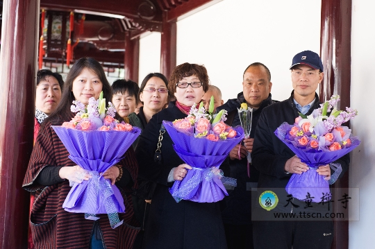 上午9时,12位男女学员手捧鲜花来到大鉴堂(方丈室)迎请浙江省佛教协会副会长、宁波市佛教协会会长、天童禅寺方丈、学佛班导师诚信大和尚。