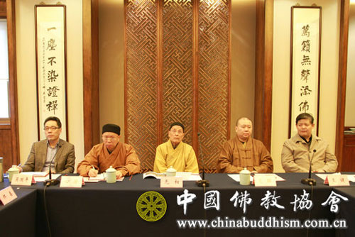 无相长老(中)、觉醒法师(右2)、心澄法师(左2)、王健秘书长(右1)、吴国平副秘书长等出席会议