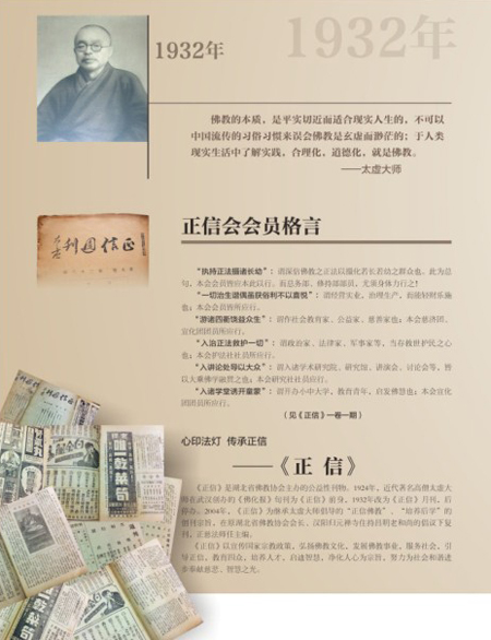 1924年,太虚大师在武汉创办的《佛化报》旬刊为《正信》前身,1932年改为《正信》月刊,明确提出《正信会会员格言》,提出“执持正法摄诸长幼”。太虚大师曾言:“佛教的本质,是平实切近而适合现实人生的,不可以中国流传的习俗习惯来误会佛教是玄虚而渺茫的;于人类现实生活中了解实践,合理化,道德化,就是佛教。”《正信》杂志一直具有爱国爱教、引导大众、饶益众生的传统,30年代在海内外具有一定影响,日内瓦中国国际图书馆也曾来函索刊。《正信》杂志创刊后连续7年出刊不断,后因日军入侵武汉而停办。1946年复刊,后又停办。2004年,《正信》为继承太虚大师倡导的“正信佛教”、“培养后学”的创刊宗旨,在原湖北省佛教协会会长、汉阳归元禅寺住持昌明老和尚的倡议下复刊,正慈法师任主编,现为湖北省佛教协会会刊。