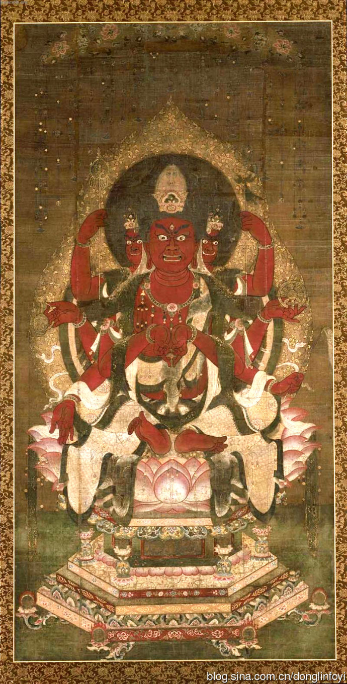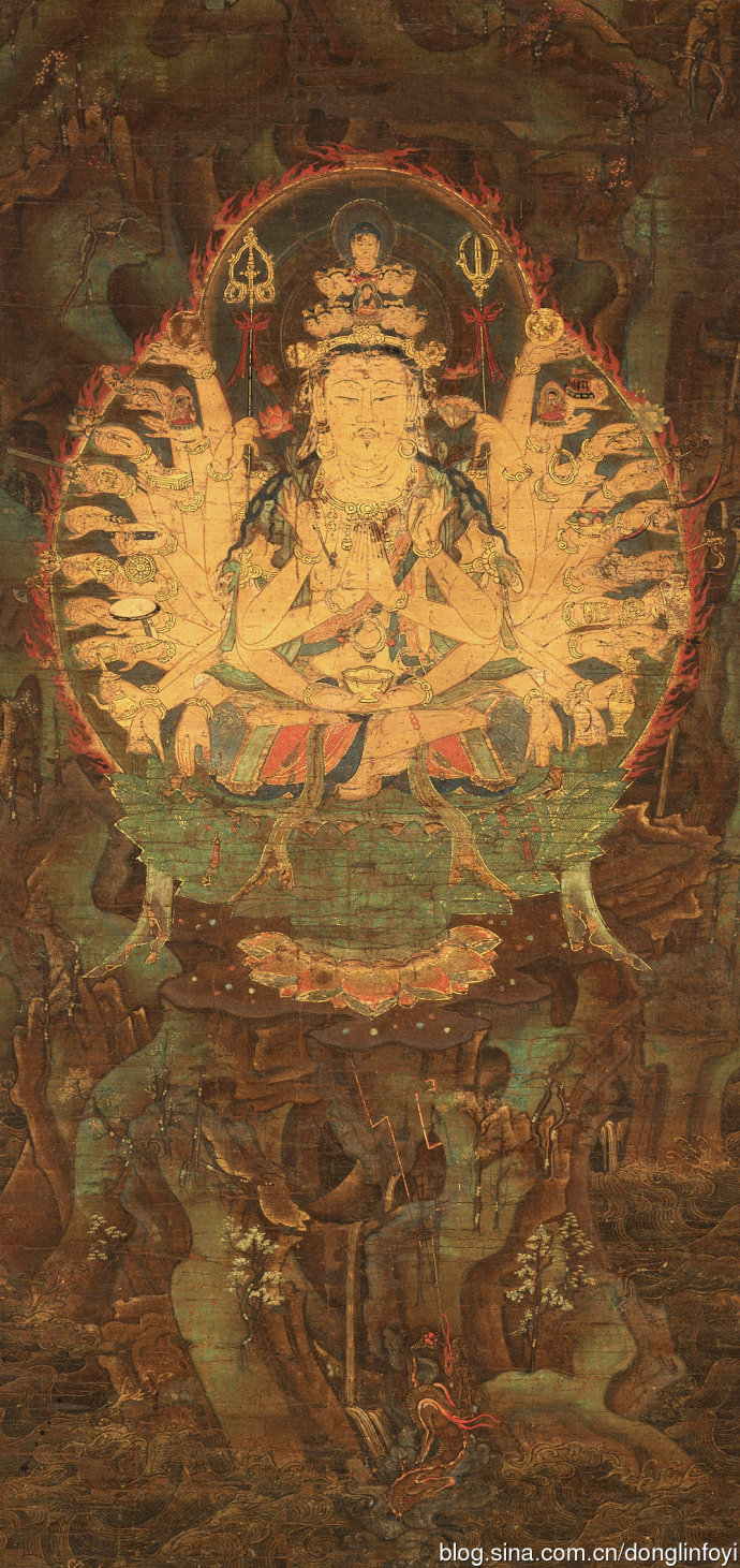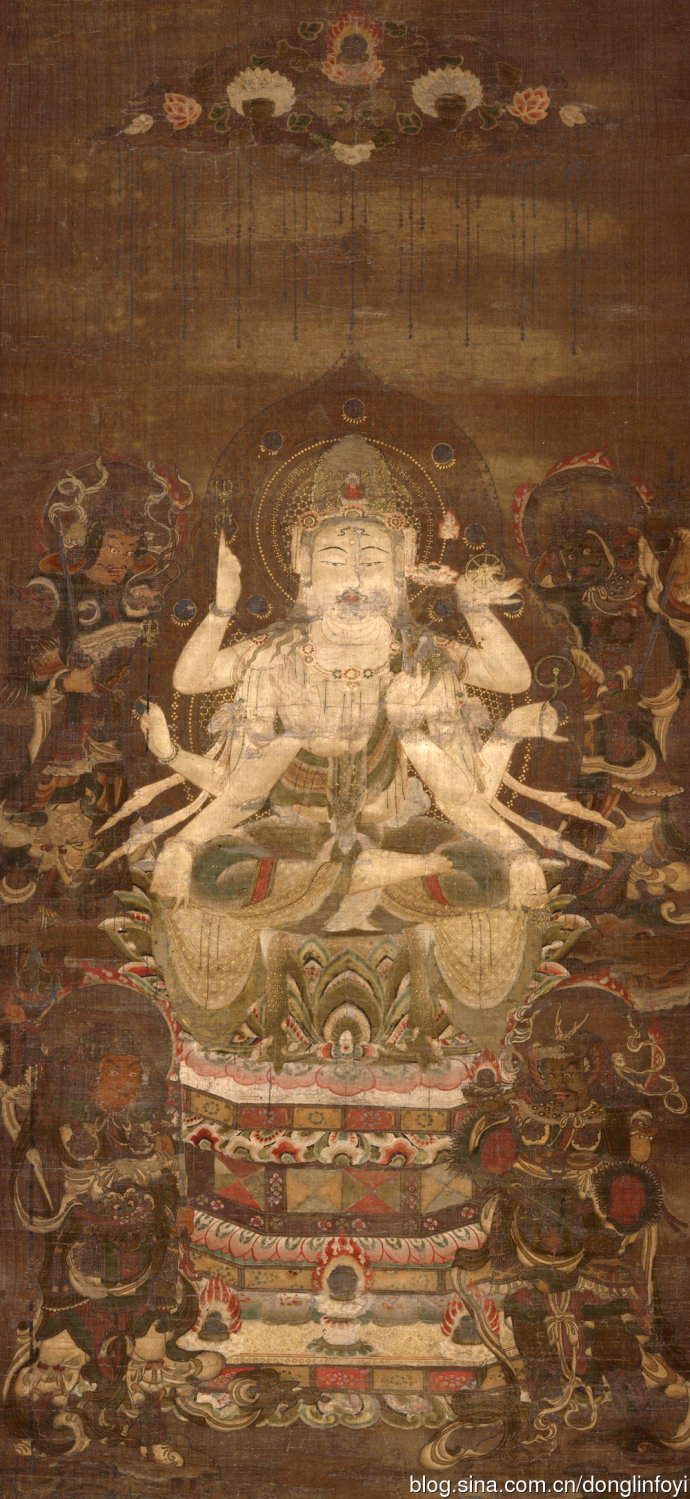 观音菩萨的变化相最多,比呈温柔慈悲之相,只有马头观音现怒相。《大日经疏》卷五称其"做极吼怒之状,此是莲华部愤怒持明五也"。马头观音双眼上吊,獠牙显露,照破众生之明暗,并以击毁恶趣苦恼为本愿。