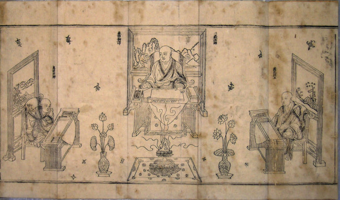 明代玄奘译经图,出自明代木版刻印大藏经《洪武南藏》之扉画,位于《大乘百法明门论疏》卷首。描绘玄奘三藏和他的弟子窥基法师、慧沼法师翻译佛经的场面,三位法师执笔坐于书案前,身后是山水屏风,书案上摆放文房四宝和经卷,画面静中有动,构图巧妙,乃明代版画艺术中的传神之笔。亦是中国佛教慈恩宗传世图像之法宝。