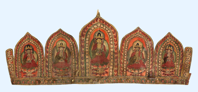 此五佛冠中心为手持法轮的毗卢遮那佛、右侧为手持羯磨杵的北方不空成就佛及手持莲花的西方阿弥陀佛。