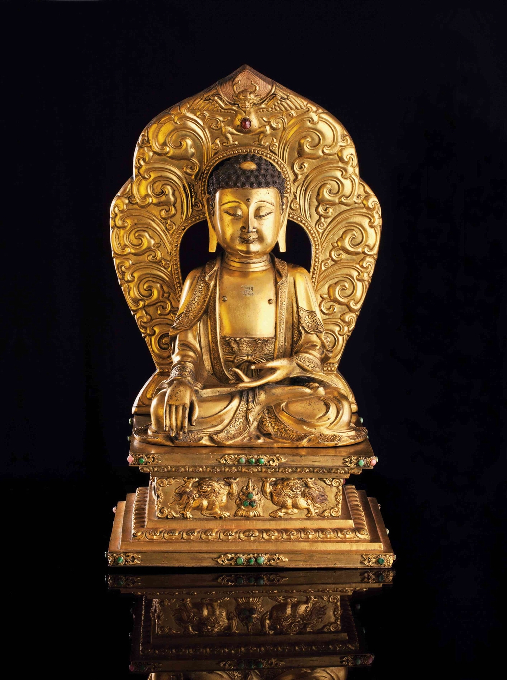 释迦牟尼佛坐像清康熙高33.5厘米重8715克黄铜鎏金镶嵌东珠