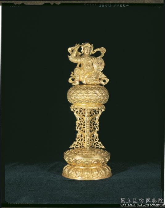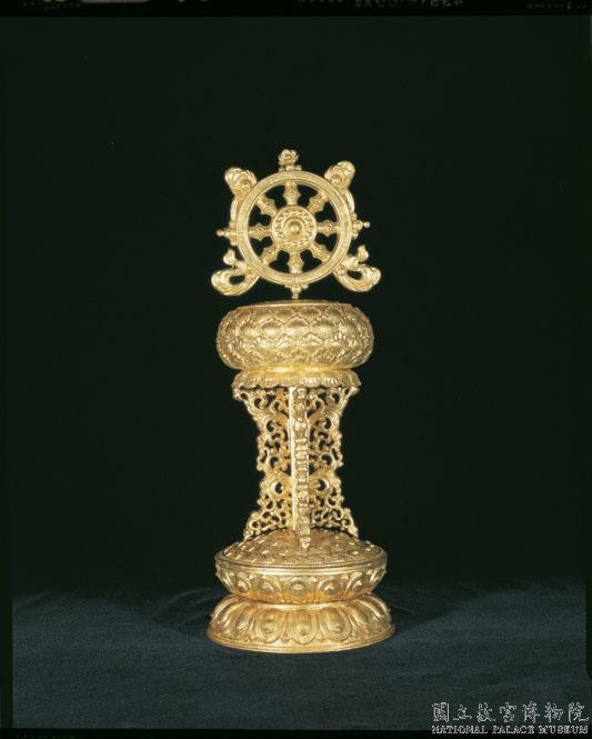 宝轮亦称轮宝或金轮宝;千辐金轮从天降临,有大威力。轮王巡幸天下,有千辐金轮导引,剎那间便能返回宫中。象征智慧*轮常转,可使众生开悟成佛。镀金宝轮作圆轮形,轮外饰火珠及飘带,置于莲花座上,莲花下以四片卷叶承托置于圆形台座上,台座上刻水波纹及仰覆莲瓣。