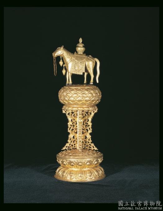 宝马亦称马宝;有青、黄、赤、白四匹。项颈线条优美,奔驰迅捷快速,性情温驯。马宝,代表精进,勇往直前、速奔彼岸。宝马装饰华丽,胸前悬珠饰,背上均驼有宝瓶,置于莲花座上,莲花下以四片卷叶承托置于圆形台座上,台座上刻水波纹及仰覆莲瓣。