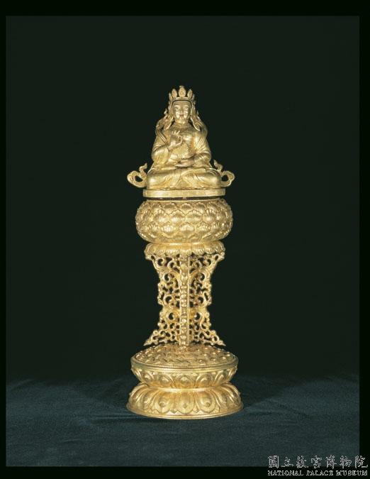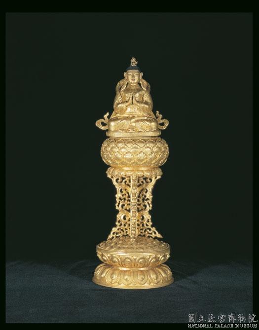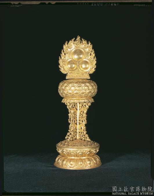 宝珠迭成品字形,其外则饰以熊熊光焰,置于莲花座上,莲花下以四片卷叶承托置于圆形台座上,台座上刻水波纹及仰覆莲瓣。