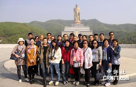 两岸记者联合采访团在鲁山大佛脚下合影(河南省台办供图)