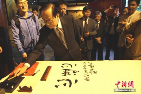 日本前首相福田康夫江苏扬州大明寺题汉字“心连心”