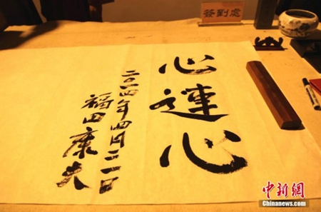 日本前首相福田康夫手书汉字“心连心”