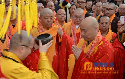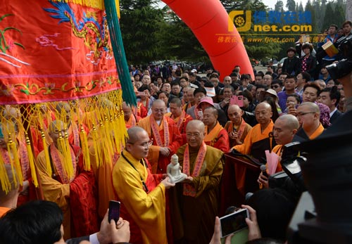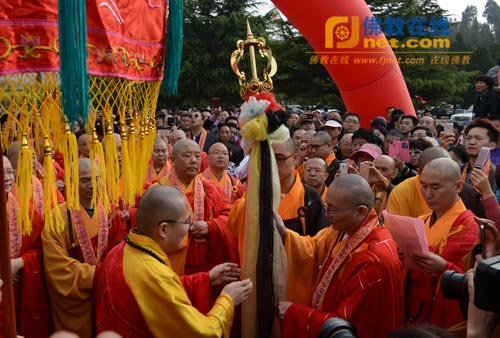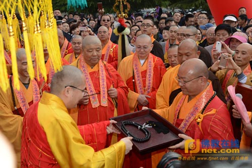 上午8时许,在南山寺山门前,南山寺两序大众排着整齐的队伍,双手合十,在悠扬的法乐声中,虔诚恭请真龙法师拈香说法。接着,养航法师、心保法师、果光法师、宏度法师、长顺法师、性妙法师、大愿法师、果悦法师等分别向真龙法师送祖衣、挂珠、钵、锡杖、拂尘、禅杖、具等。柬埔寨僧王布格里大长老、泰国泰恩法师分别向真龙法师赠送了佛像。